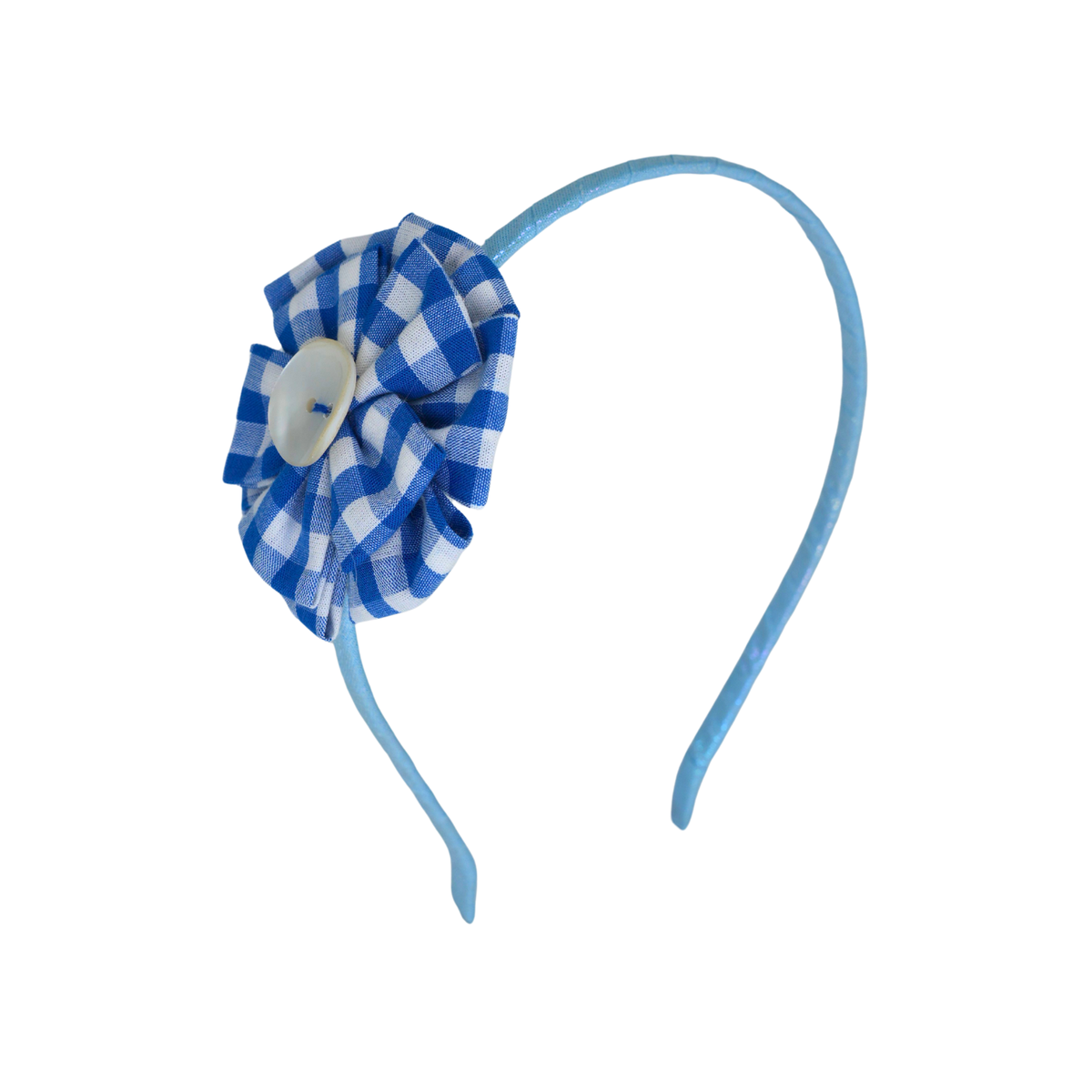 Charming and elegant, this Blue Gingham Flower Headband brings a perfect blend of playful design and refined detail. The soft blue-and-white gingham flower is beautifully accented with a luminous mother of pearl button center, adding a subtle touch of sophistication. Ideal for daily wear, festive occasions, or as a chic accessory to complement any outfit, this headband combines comfort, style, and timeless appeal.