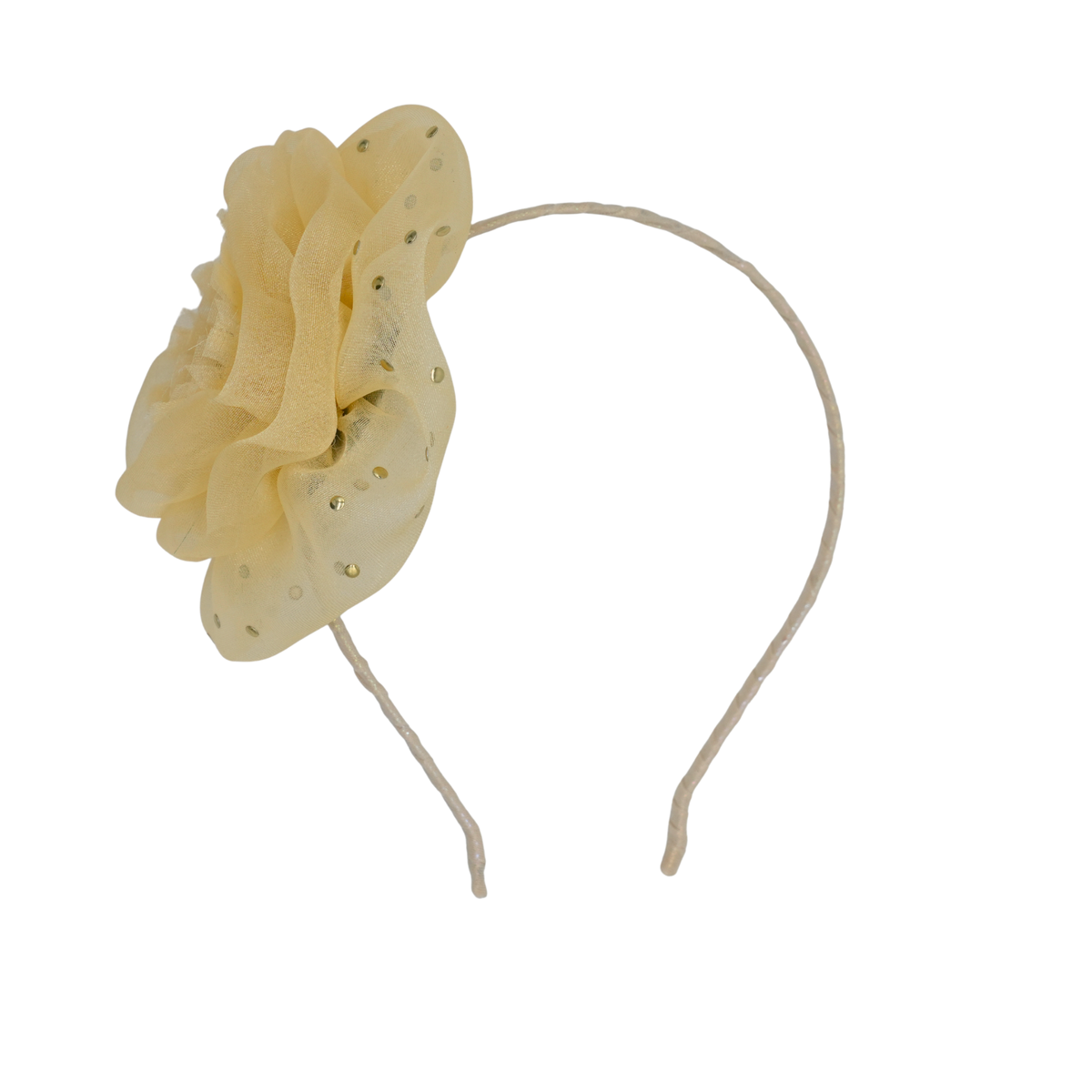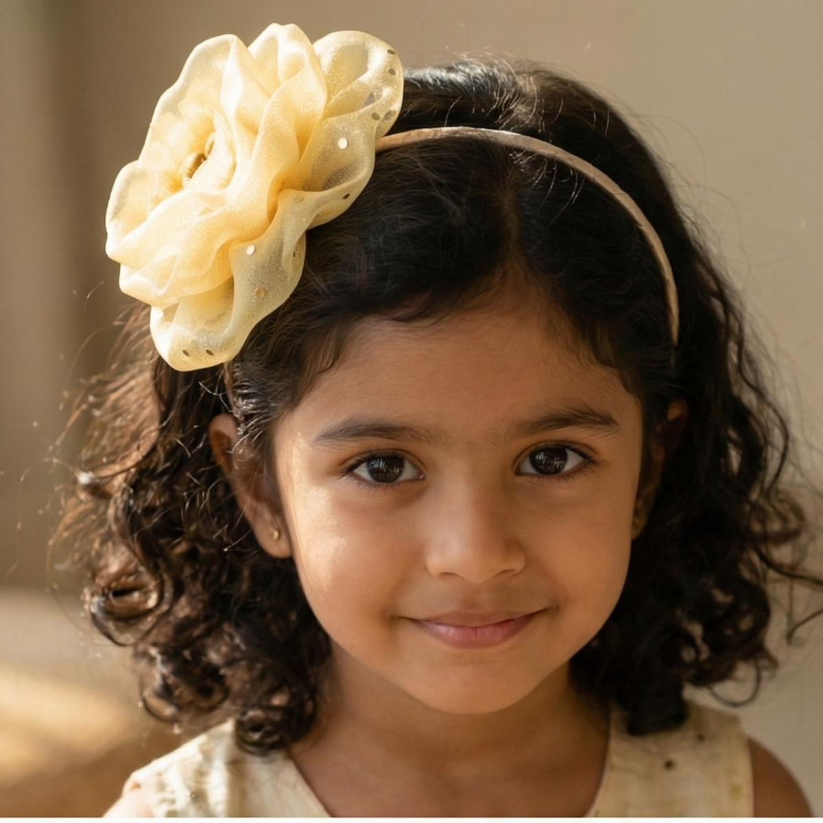 Radiate grace and charm with this Light Yellow Embellished Organza Peony Statement Headband. Crafted with a delicate organza peony flower, this headband features sparkling embellishments that add a touch of luxury and refinement. The soft pastel yellow hue brings a warm, elegant vibe, making it perfect for festive occasions, parties, photoshoots, or as a standout everyday accessory. Designed for both comfort and glamour, this piece beautifully combines sophistication and style.