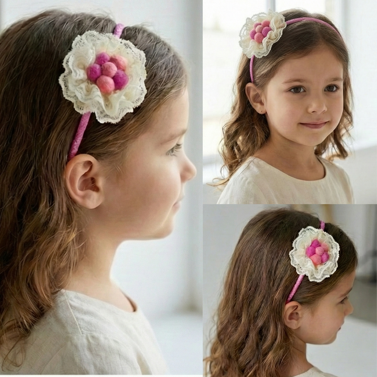 Delicate and charming, this Lace Rose Headband adds a sweet and playful touch to any outfit. Adorned with a beautifully crafted lace rose and soft felt balls in pink and peach tones, this accessory perfectly balances elegance and cuteness. Designed for comfort and style, it’s ideal for babies, girls, or women who love subtle, handcrafted details that make a statement in a gentle way.