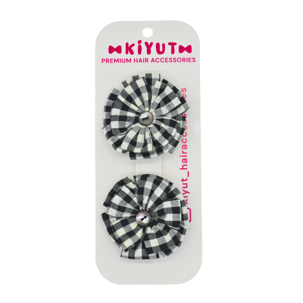 Add a sophisticated and charming touch to any hairstyle with this Set of Two Black Gingham Fabric Flower Hair Clips. Each flower is crafted from soft black gingham fabric and features a delicate mother-of-pearl button at its center, giving a subtle yet elegant accent. Perfect for parties, festive occasions, or casual wear, these clips are lightweight and comfortable, making them suitable for both children and adults.