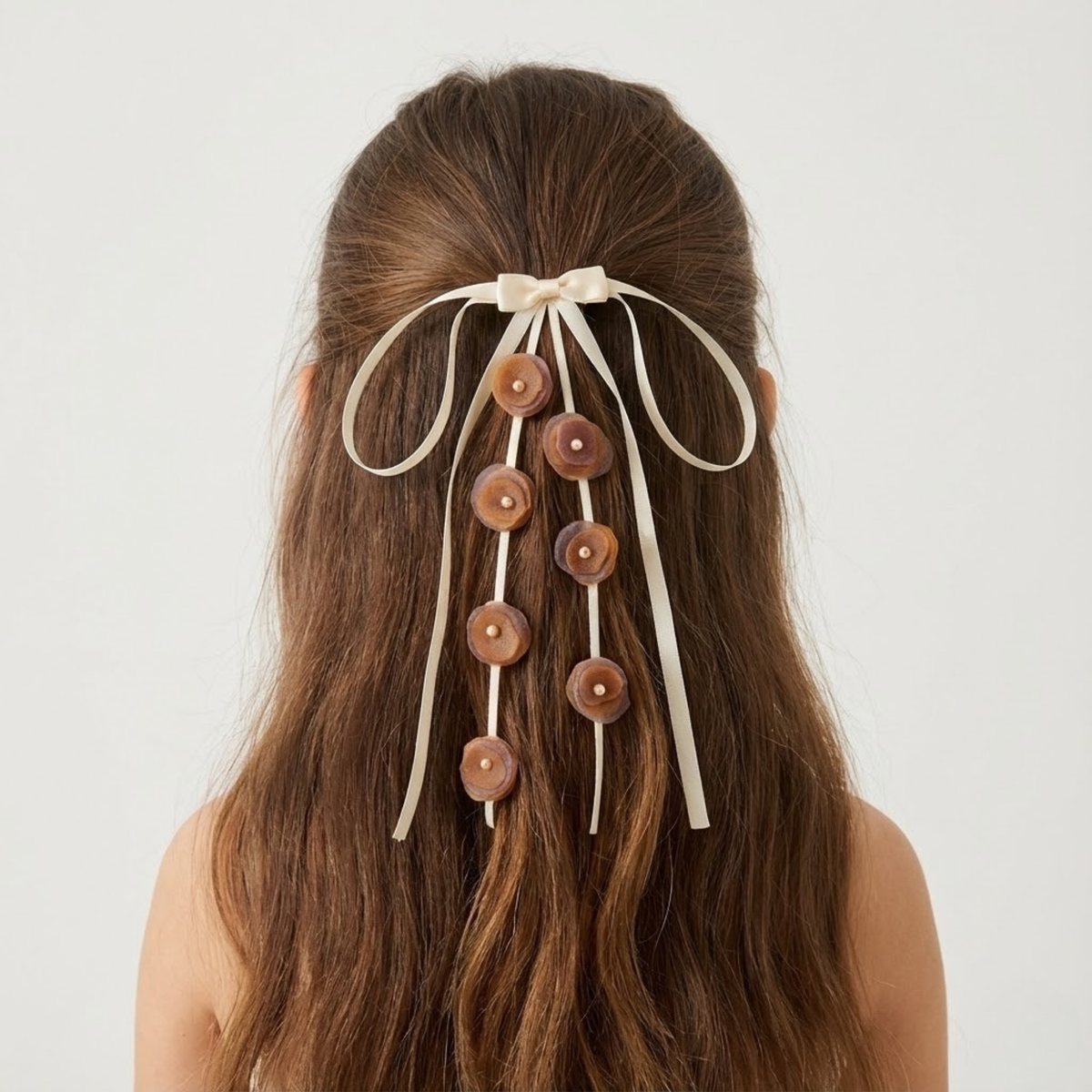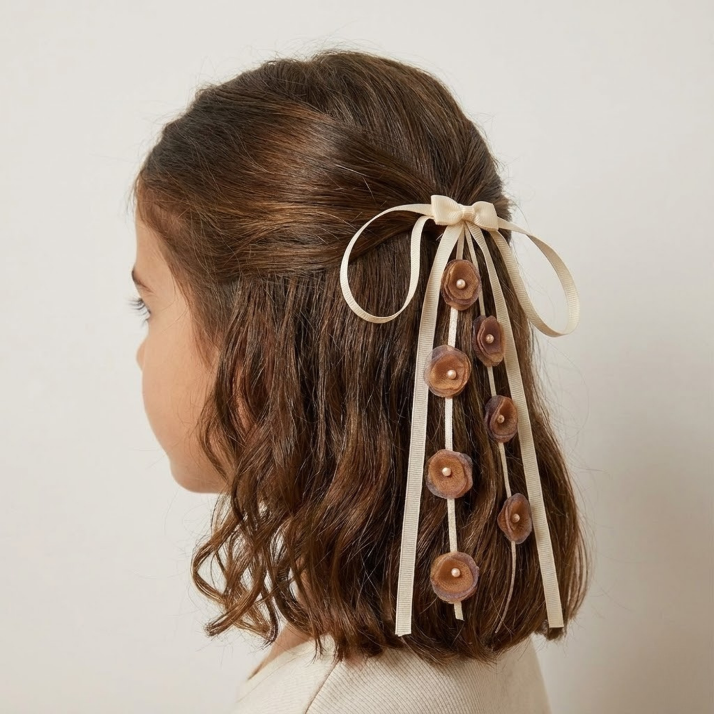 Add a touch of romance and sophistication to your hairstyle with this Flower Trail Long Satin Bow Clip in a graceful cream shade. Crafted from premium satin fabric, this bow features a cascading design adorned with delicate floral appliqués, creating an elegant trail effect that flows beautifully with your hair. The subtle sheen of the satin combined with the soft floral accents makes it perfect for festive occasions, weddings, or elegant everyday styling. The strong metal clip ensures a secure and comfortable hold while maintaining the bow’s graceful drape.