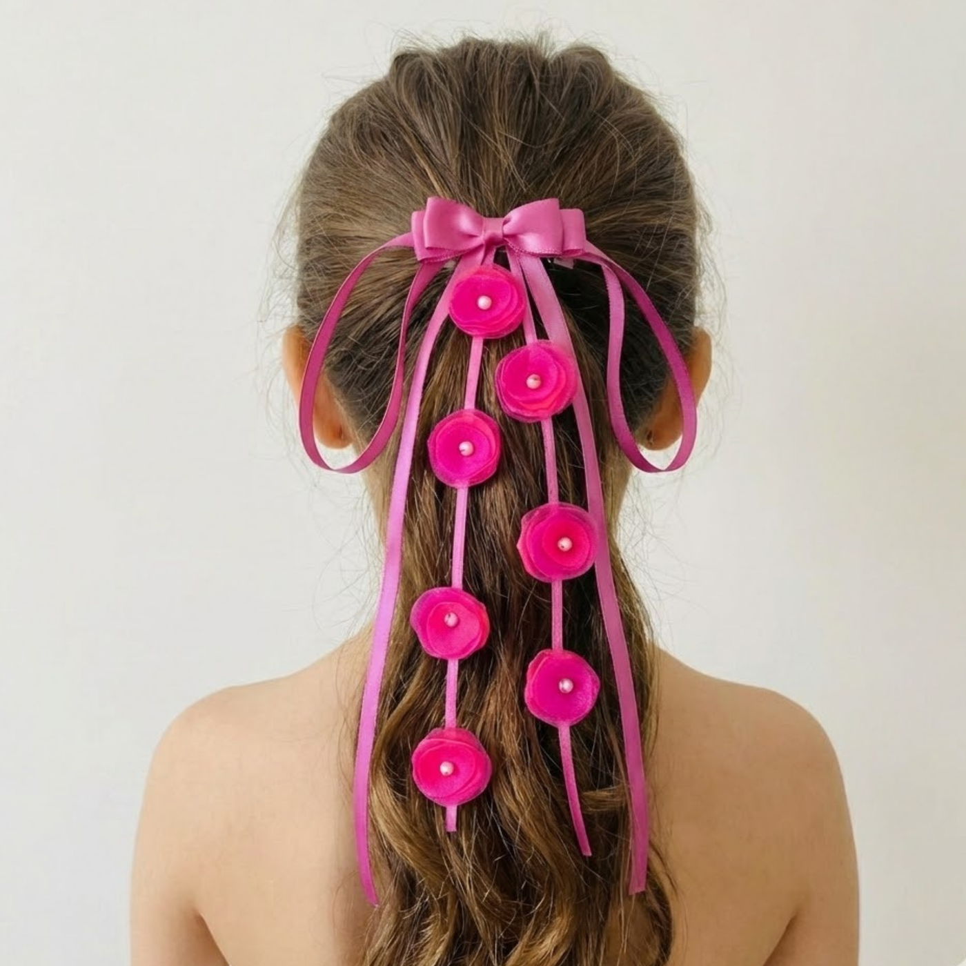 Add a vibrant pop of color and elegance to your hairstyle with this Flower Trail Long Satin Bow Clip in a bold fuchsia hue. Crafted from premium satin fabric, this statement piece features a long cascading bow design beautifully adorned with delicate floral appliqués that create a graceful, flowing effect. The rich, glossy satin paired with the lively fuchsia tone makes it a perfect accessory for festive occasions, parties, or any event where you want to stand out with sophistication. The durable metal clip ensures a secure, comfortable hold while maintaining the bow’s elegant drape.
