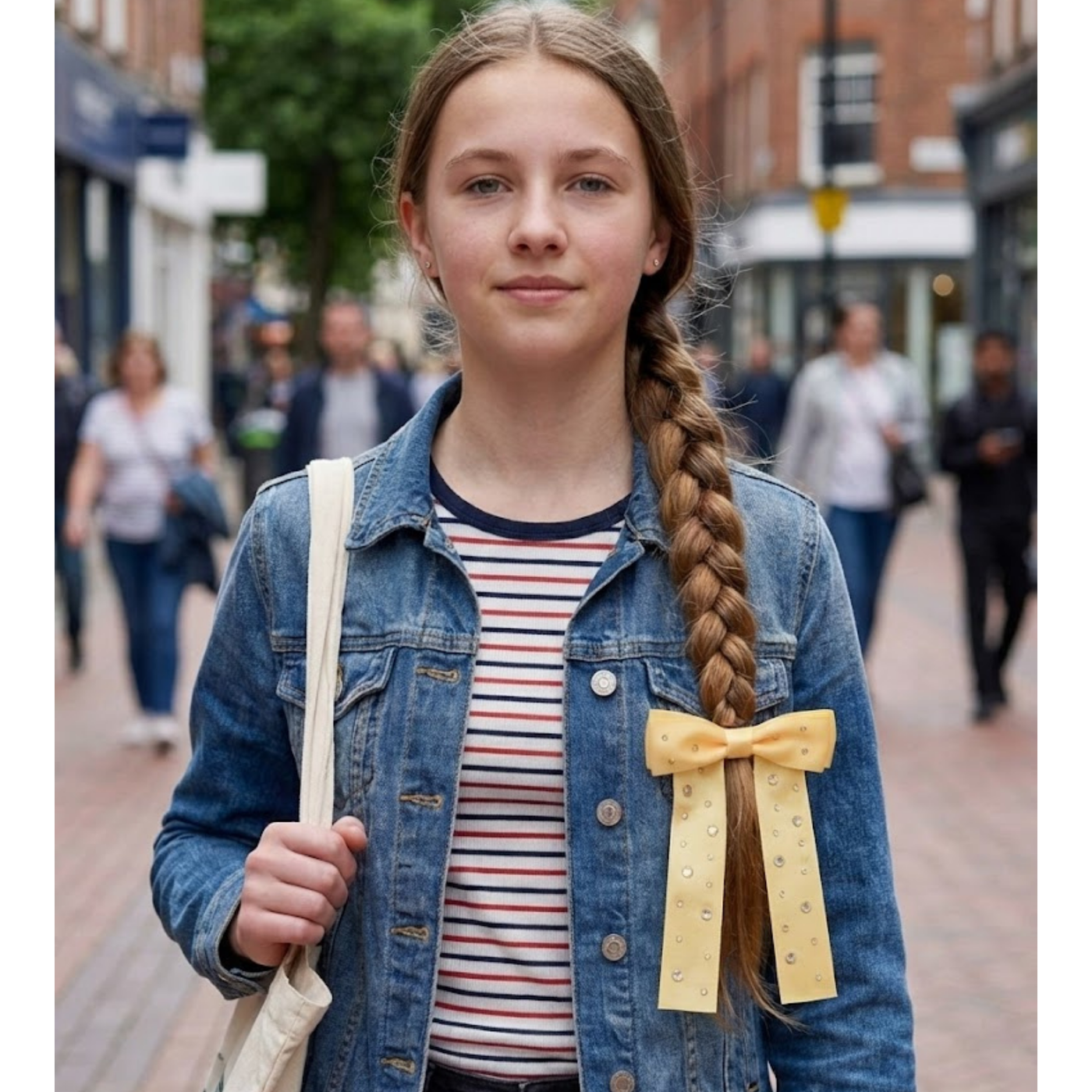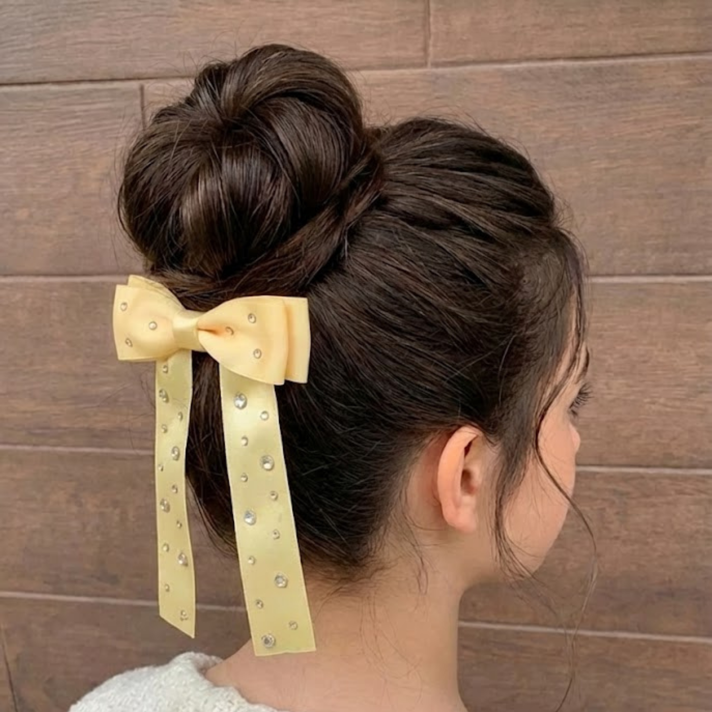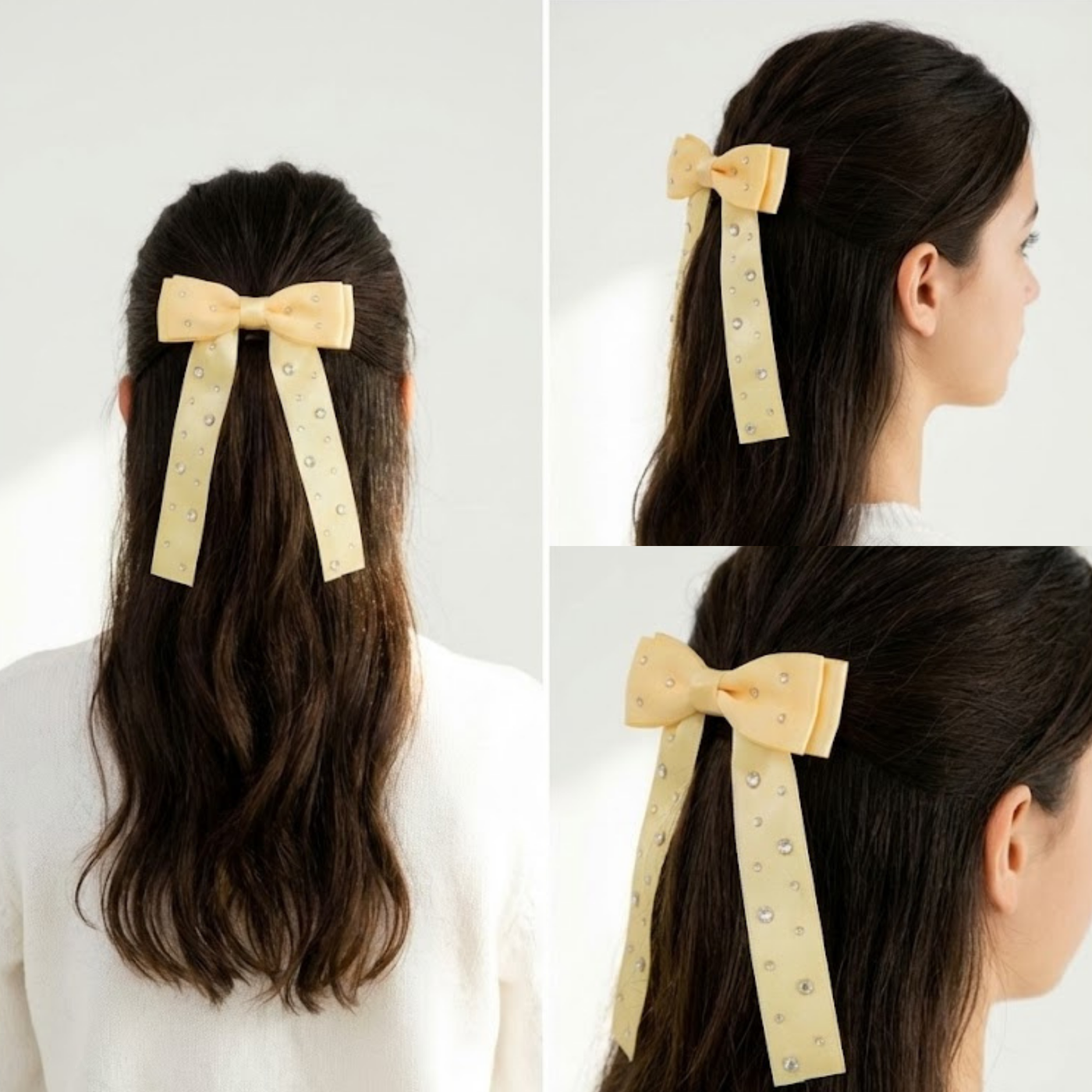 Bring a cheerful sparkle to your hairstyle with this Premium Satin Bow Barrette Clip in a vibrant yellow hue, beautifully adorned with shimmering rhinestones. Crafted from luxurious satin fabric, this bow radiates elegance with its smooth texture and glossy finish. The rhinestone detailing adds a refined touch of glamour, making it perfect for festive occasions, daytime events, or adding a pop of sunshine to your everyday look. The sturdy metal barrette clip ensures a secure and comfortable fit, keeping your hair neatly in place with effortless charm.